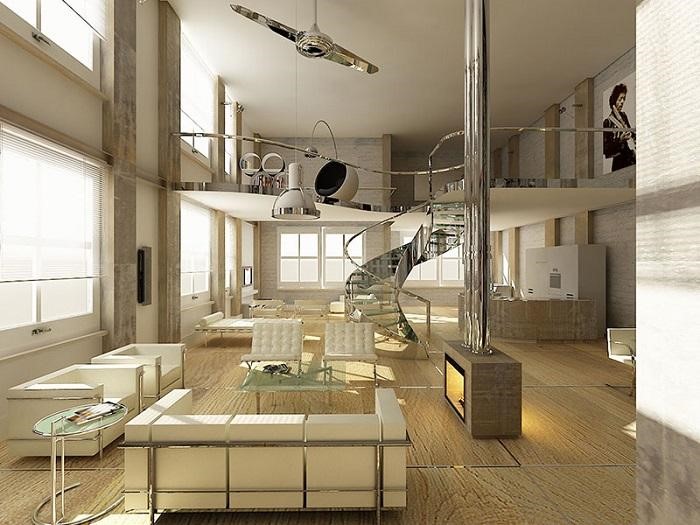 3. Thiết kế nội thất phòng khách sử dụng chất liệu kim loại.
