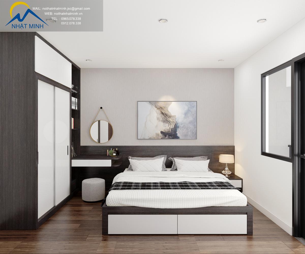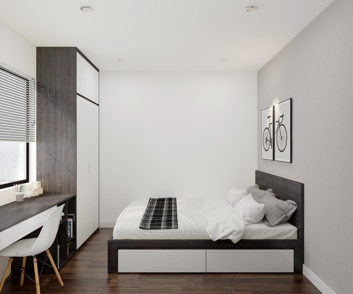 Phòng ngủ có diện tích nhỏ nên được thiết kế đơn giản gồm có giường ngủ và tủ, gầm giường được thiết kế ngăn chứa đồ tiện dụng giúp tận dụng tối đa không gian, bạn có thể cất chăn ga, gối hay quần áo. Khu vực đầu giường thiết kế tủ chứa đồ gọn gàng, ngăn nắp.