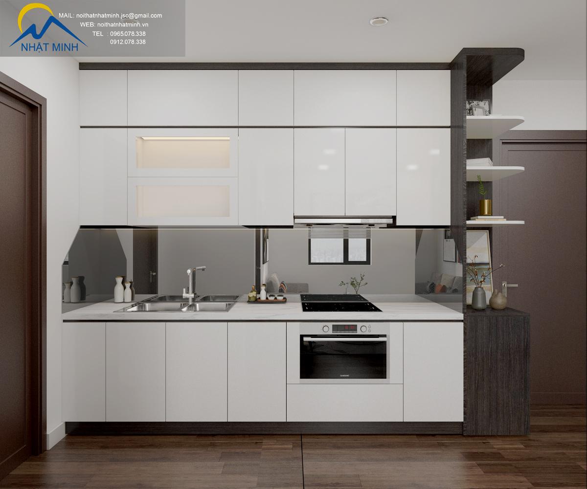 Với căn hộ chung cư mini 45m2 việc sắp xếp, bài trí nội thất sao cho đầy đủ công năng mà không bị chật chội là điều tương đối khó khăn. Tuy nhiên nhờ có kiến trúc sư của Nội Thất Nhật Minh không gian bếp được bố trí gọn gàng với thiết kế tủ bếp 2 tầng vừa tận dụng tối đa không gian góc vừa tăng thêm diện tích bố trí bếp nấu, chậu rửa,..
